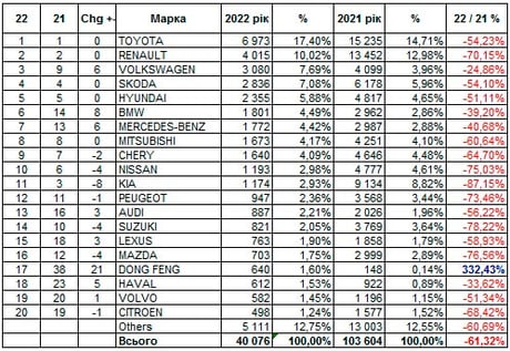 Лидером украинского рынка в 2022 году стала Toyota. Компании удалось реализовать около 7 тыс. новых легковых авто. Второе место занял Renault с результатом почти 4 тыс. автомобилей в год. Здесь без неожиданностей: обе компании были лидерами по продаже новых авто и в 2021 году.