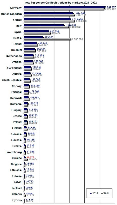 Количество проданных автомобилей в странах Европы в 2021-2022 годах