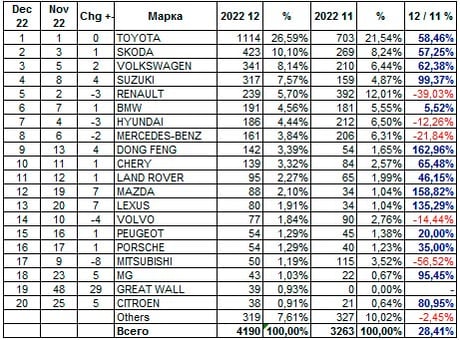 Динамика продаж новых авто в Украине, декабрь/ноябрь