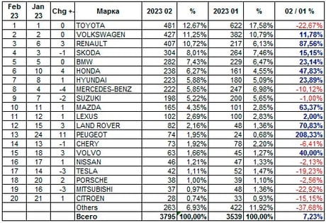 Кроме того, в феврале авторынок значительно переформатировался. Если взглянуть на рейтинг по брендам, то заметен рост влияния премиальных марок — BMW второй месяц подряд держался на пятом месте.