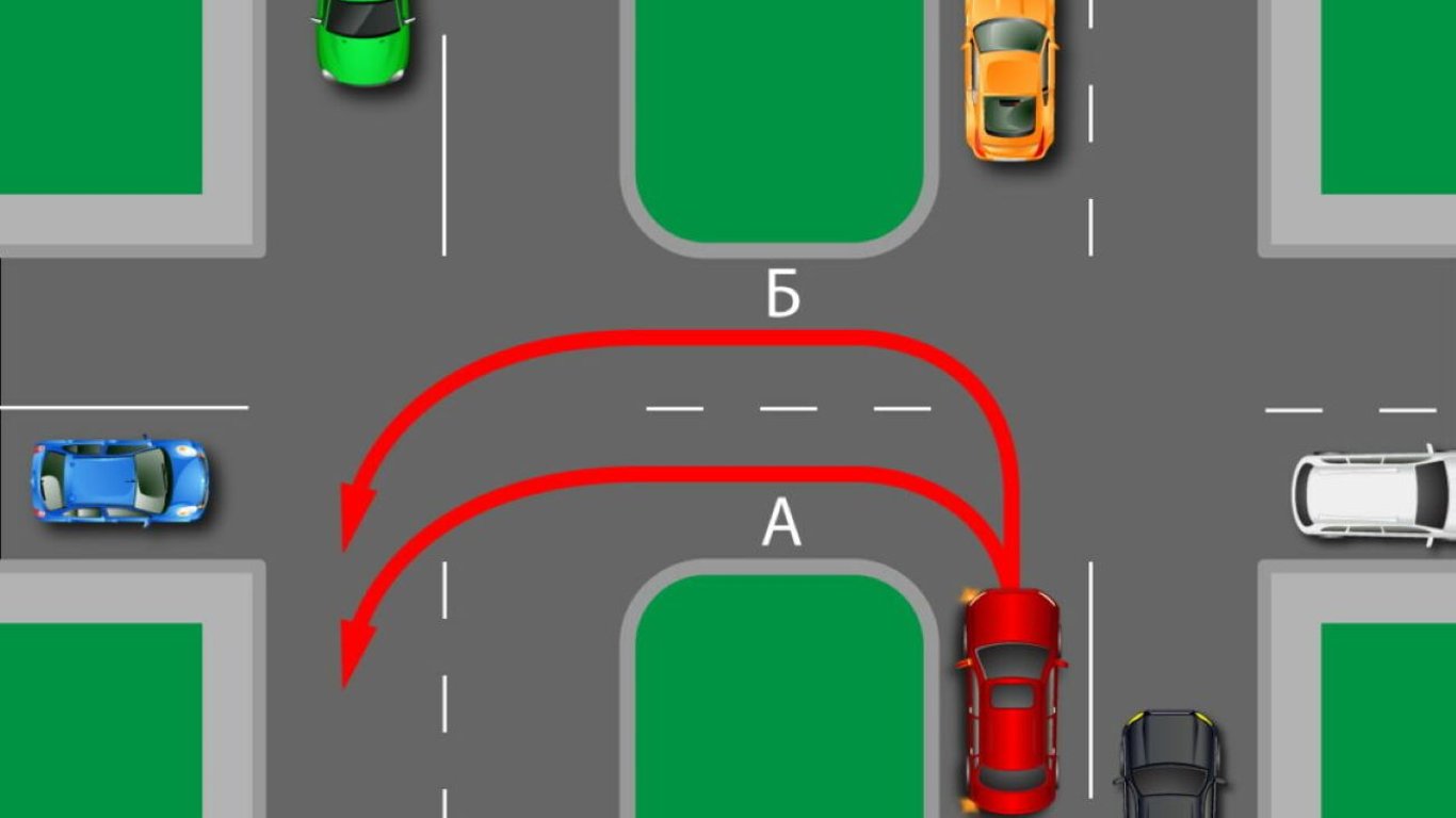 Розвертаючись на перехресті, можна рухатися за будь-якою траєкторією, але в межах одного перехрестя проїжджих частин.