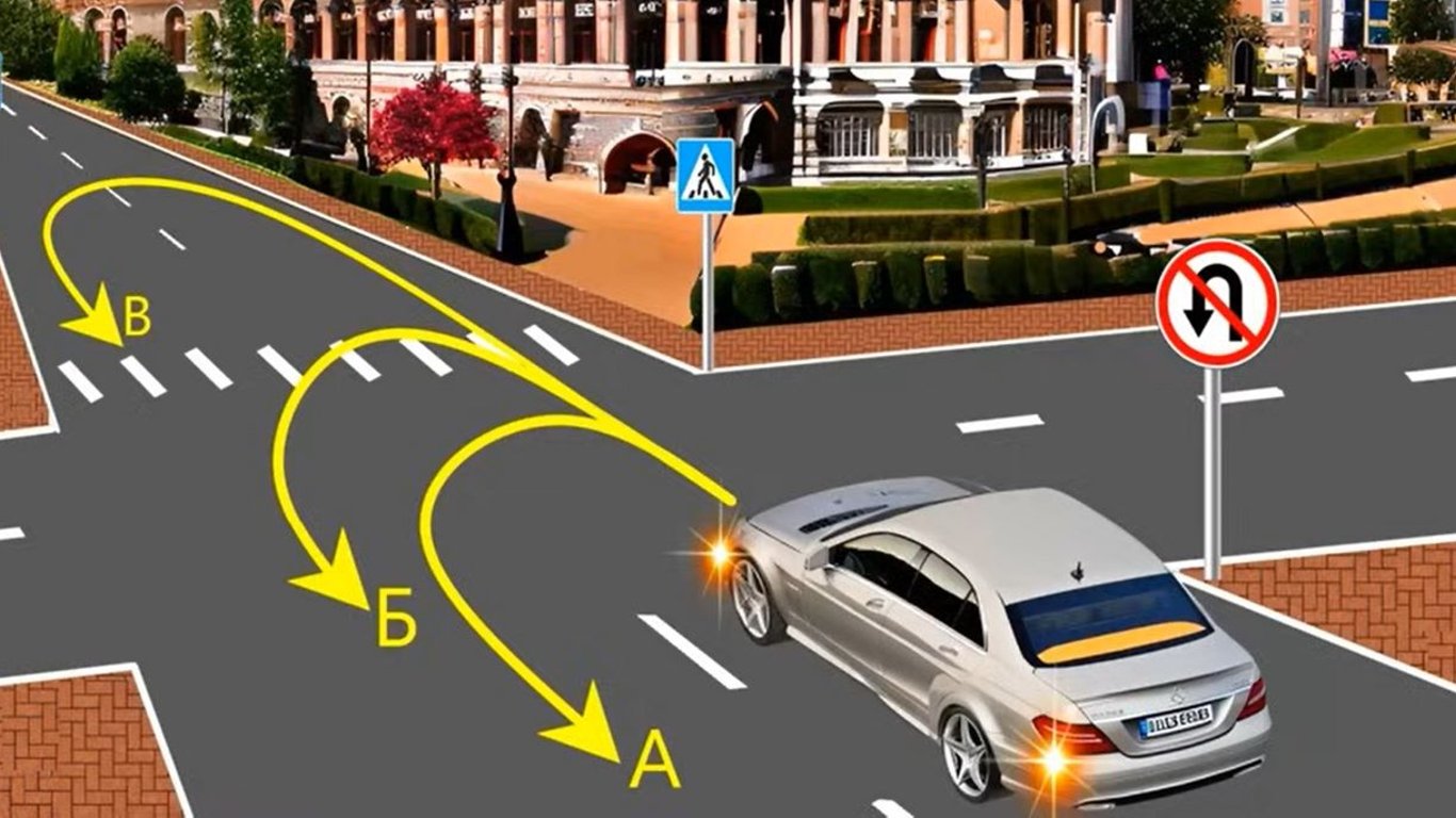 Отже, забороняється розворот на пішохідному переході — за траєкторією Б. А про заборону на розворот через місце зупинки маршрутного транспорту у правилах не йдеться.