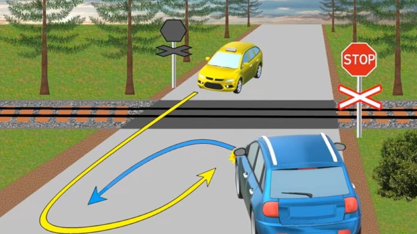 Водії авто намагаються виконати розвороти. Водій синьої машини бажає виконати маневр до переїзду, а водій жовтої — за переїздом.